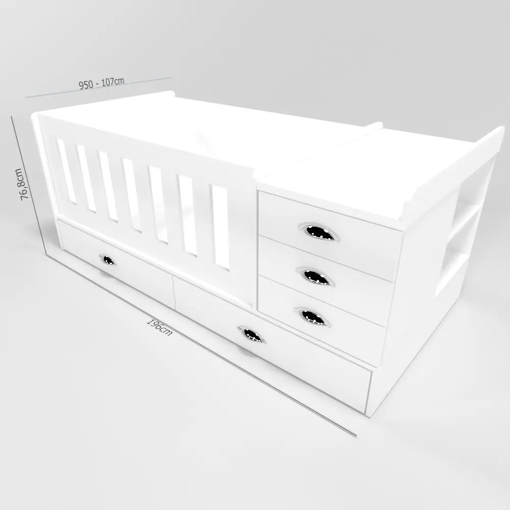 • Medidas cuna: alto 76,8 cm, ancho 196 cm, profundidad 95 o 107 cm