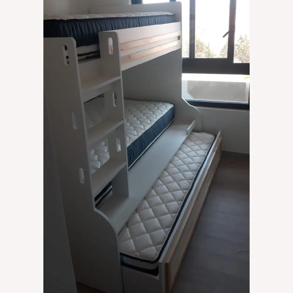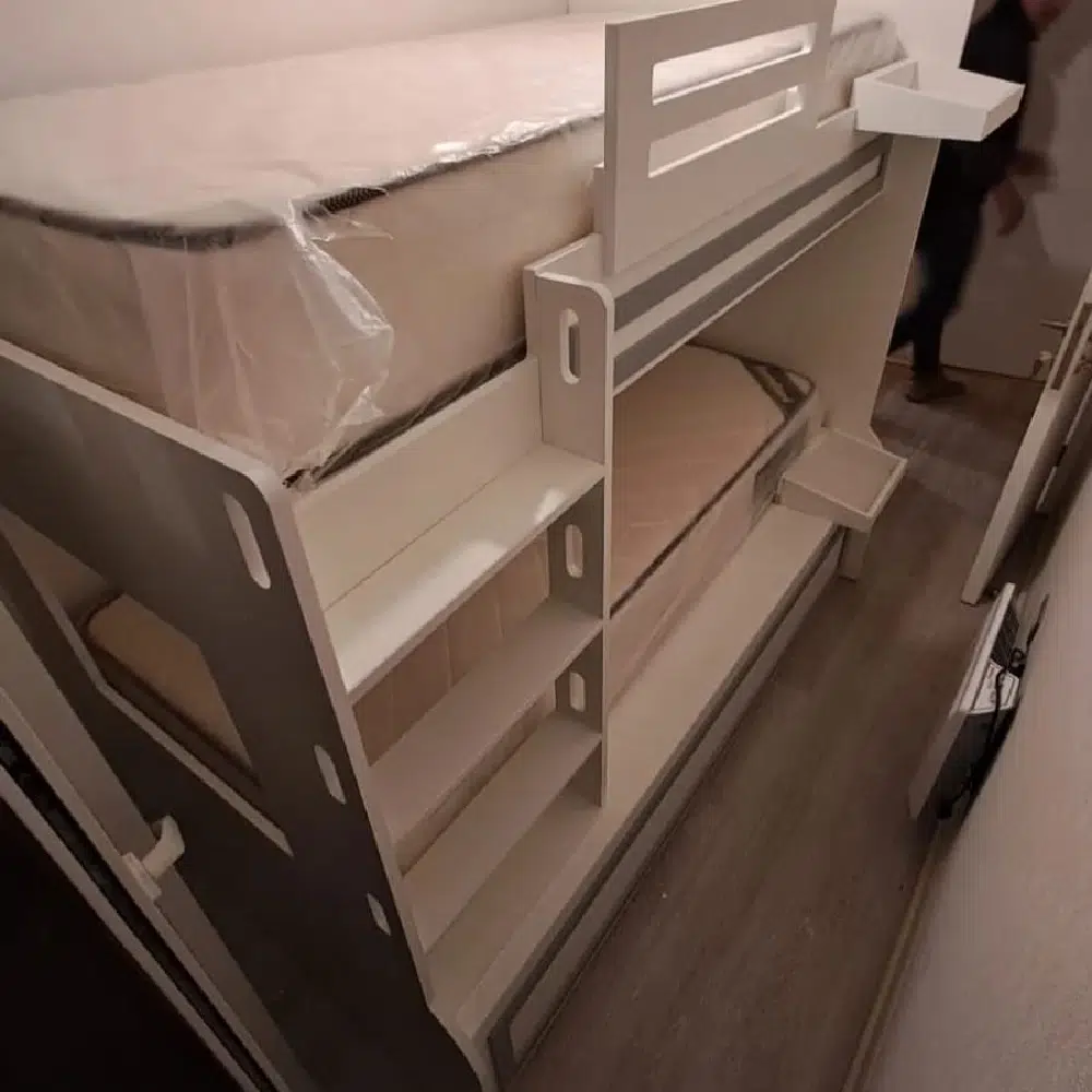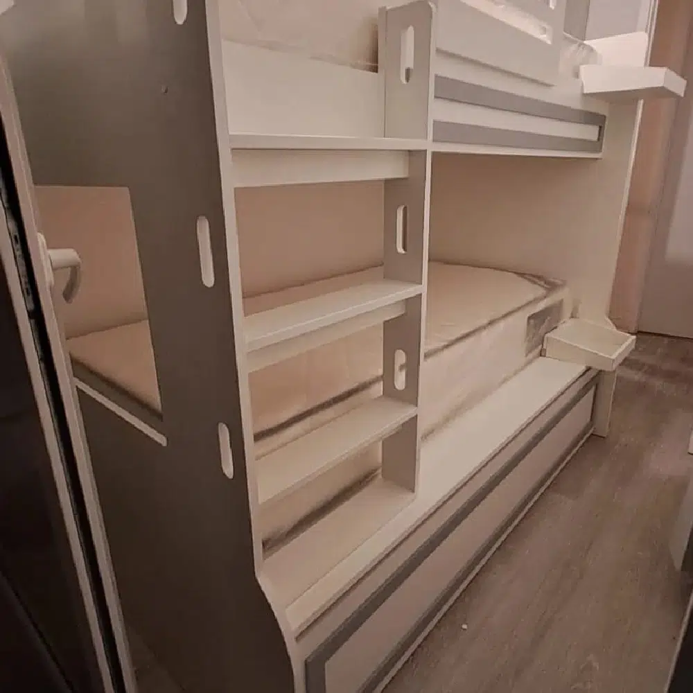Un camarote cama nido de diseño lindo y elegante, las bandejas que se aprecian en cada somier son movibles, además tiene garantía por defecto de fabricación(no incluye por mal uso, golpes o raspones), puedes revisar variedad de modelos en Camarotes.