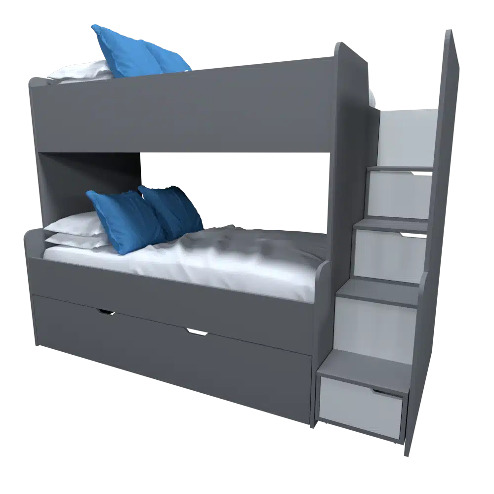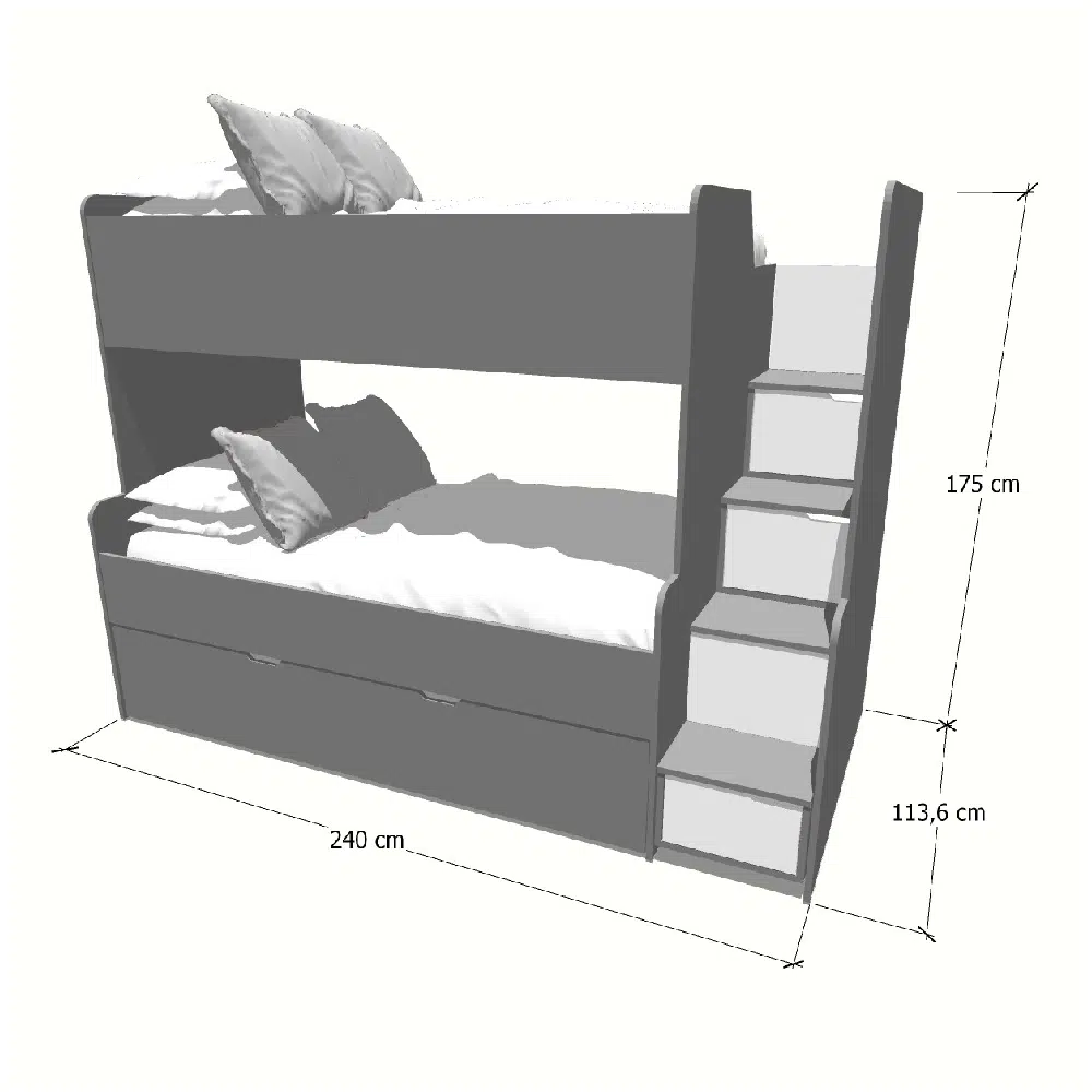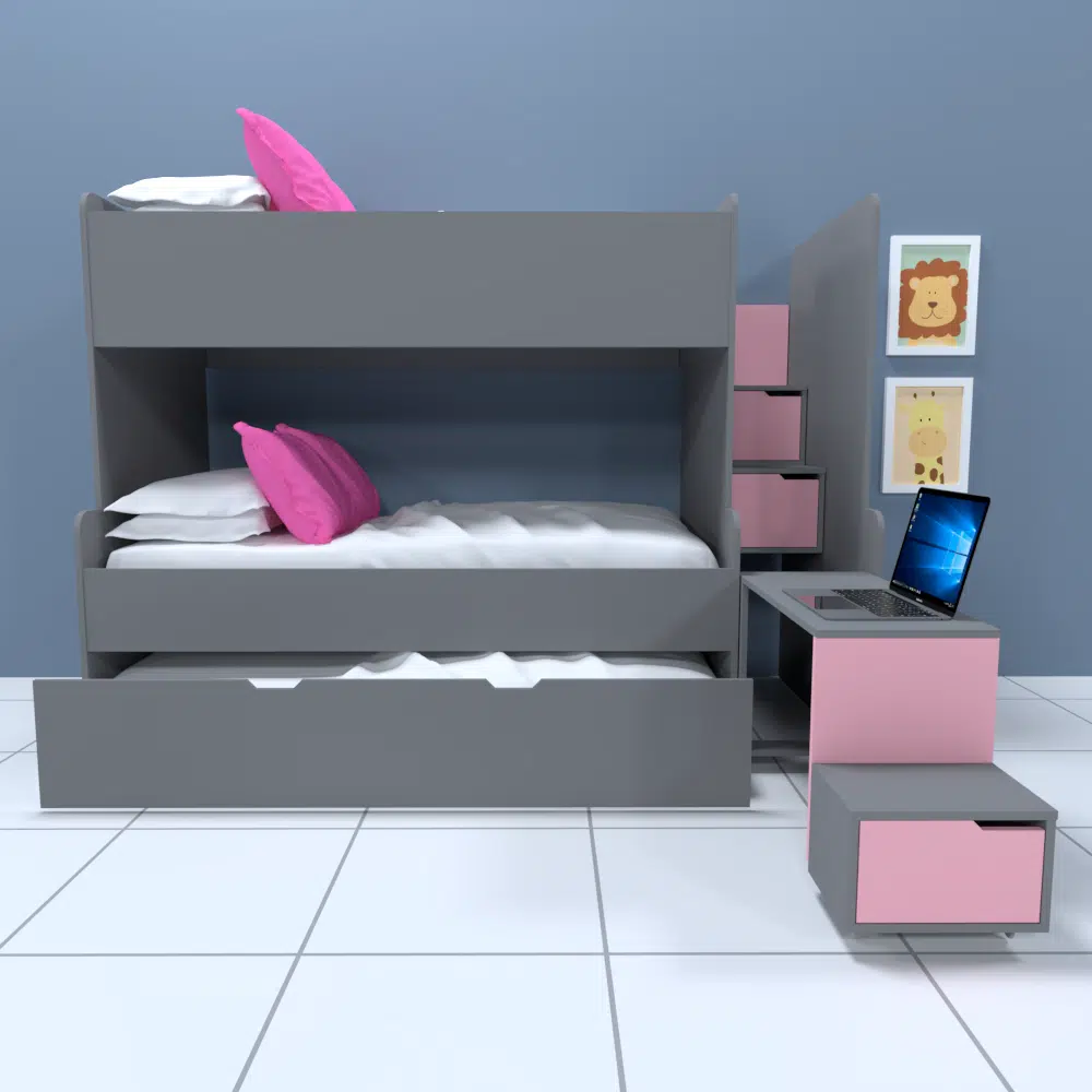 Hermoso camarote infantil 3 camas hecho en melamina 18mm, un diseño multifuncional con escalera cajonera y escritorio incorporado, ideal para espacios pequeños, si desea personalizar medidas o color se realiza con un costo adicional, contáctanos.