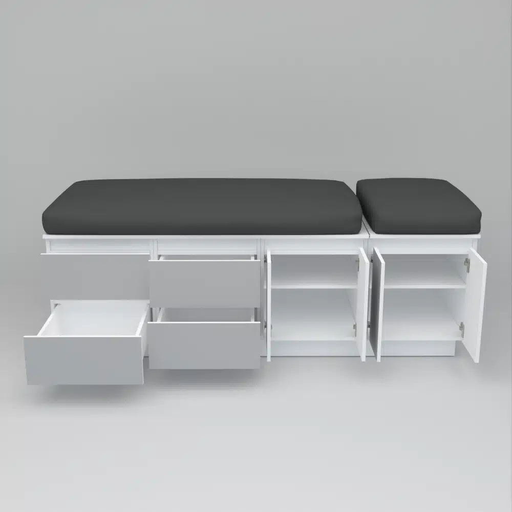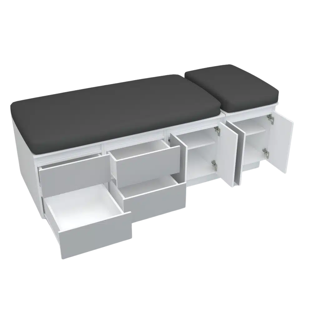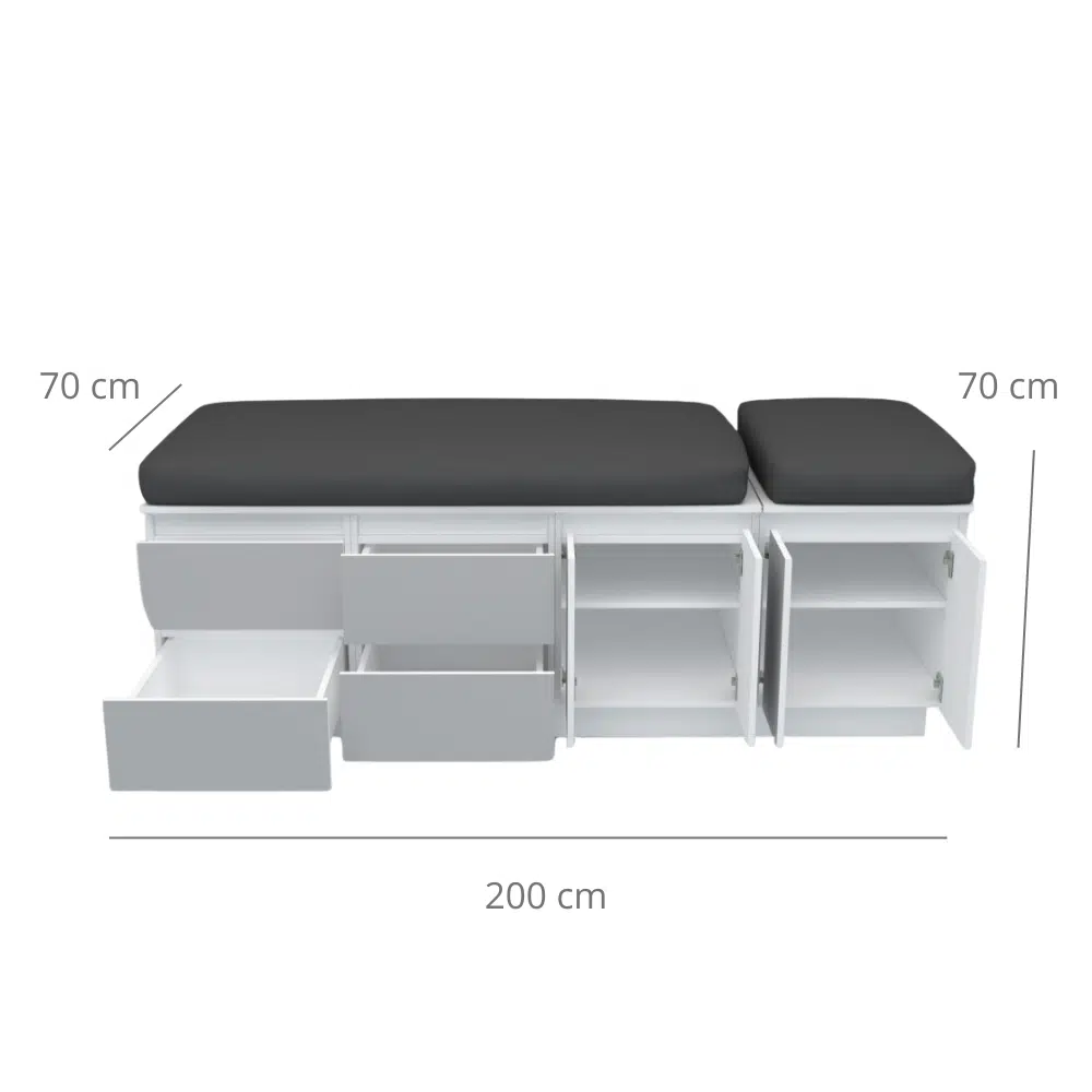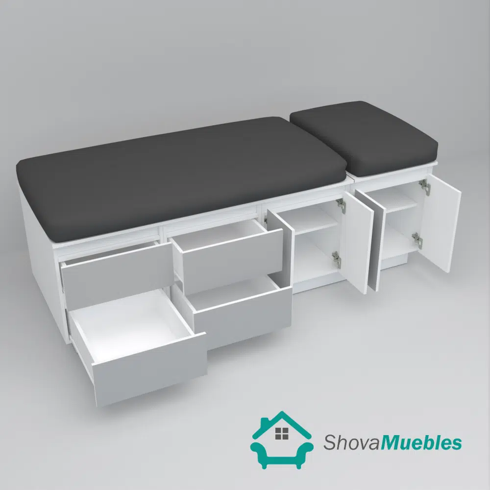 Hermosa camilla funcional para masajes, en melamina blanca, enchapada en formalita gris, diseño elegante para tu salon, si deseas personalizar medidas y color se realiza con un costo adicional, contactanos.