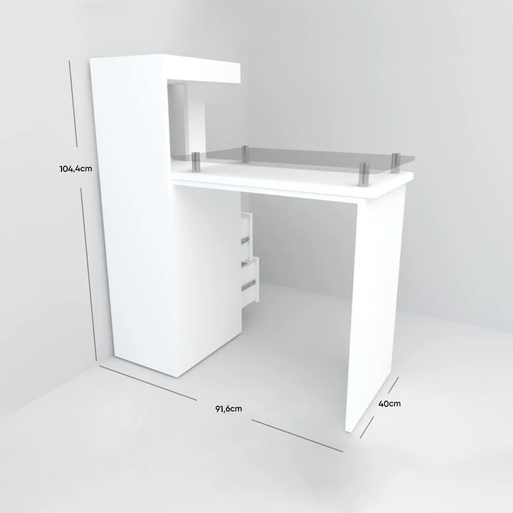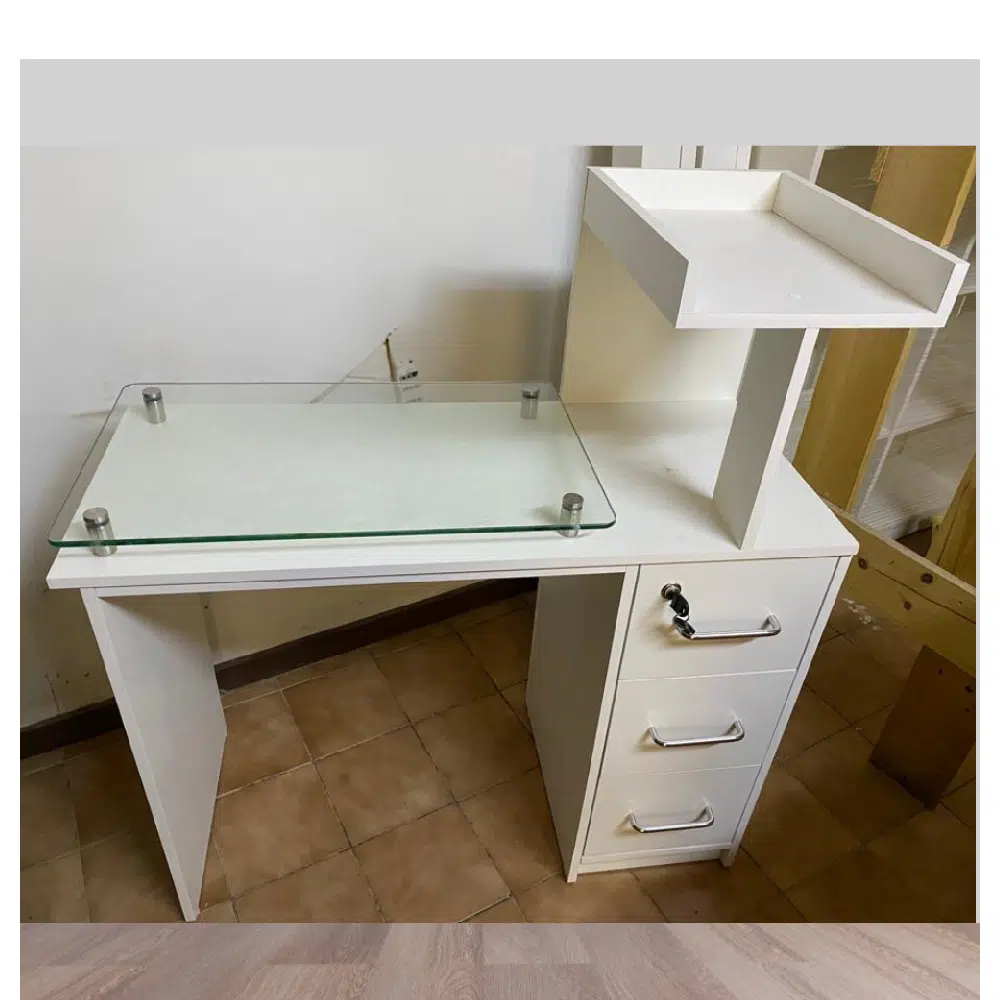 Mesa manicure con vidrio, tiene una estructura firme con un diseño elegante y funcional; además tiene su instalación gratis en todo Santiago; también incluye una garantía de 3 meses por defecto de fabricación(no incluye por mal uso, golpes o raspones), puedes revisar variedad de modelos y si deseas otro color revisa los tonos.