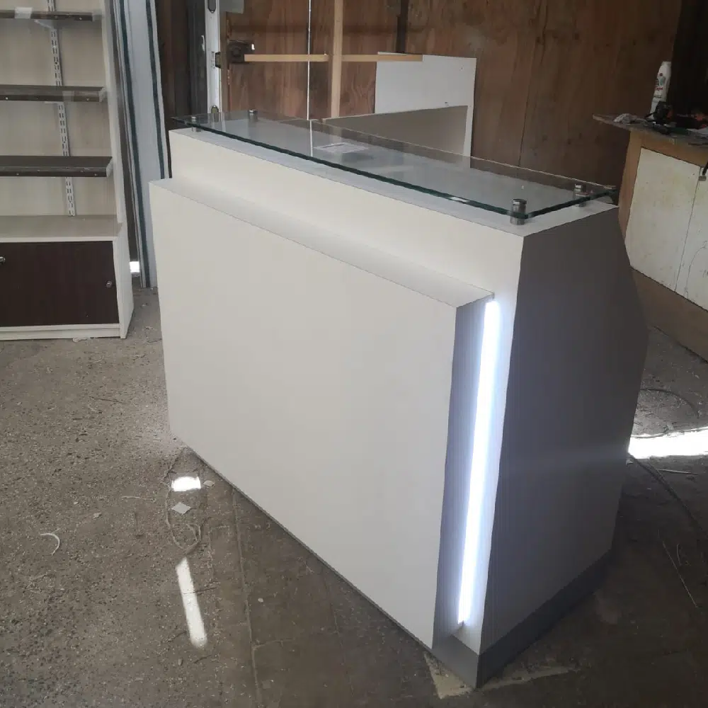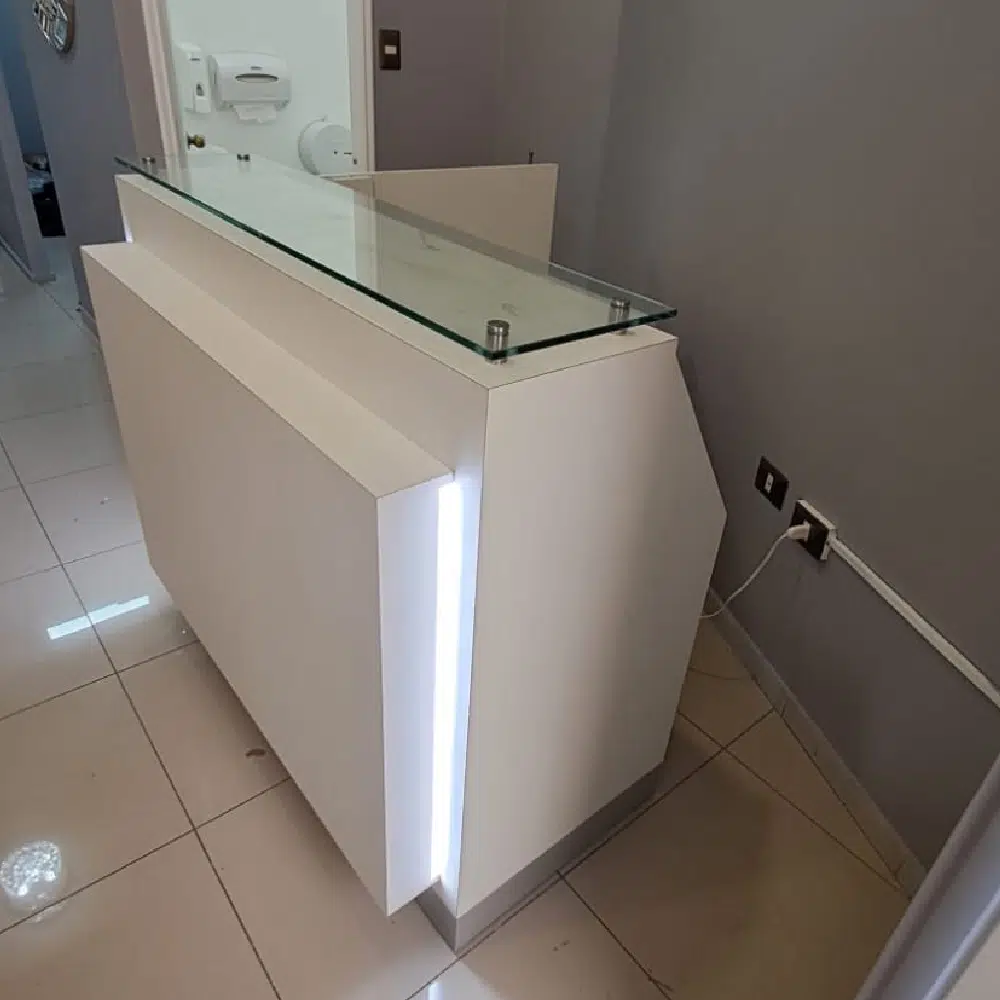 Hermosa recepcion a medida en melamina blanca con enchape en formalita, la instalación es gratis en todo Santiago, se realizan envíos a regiones.