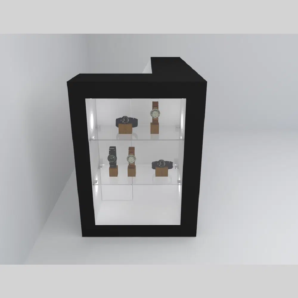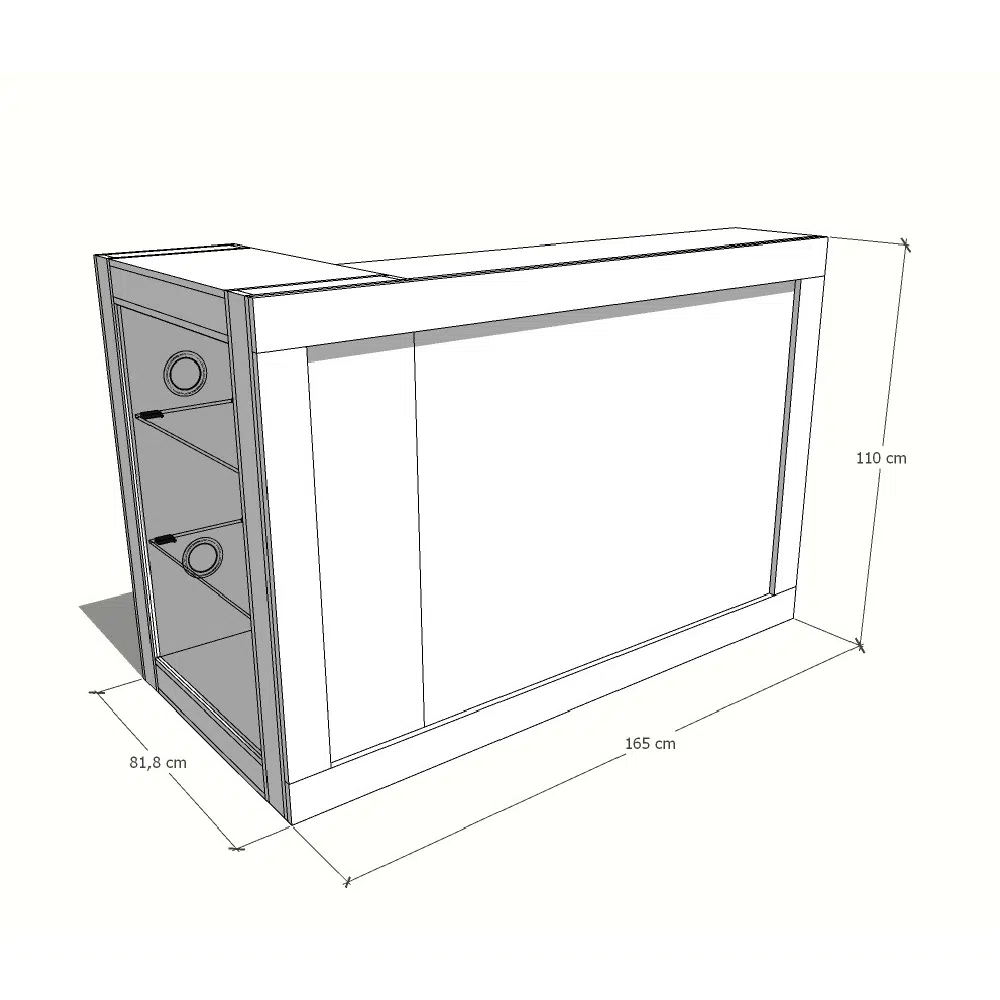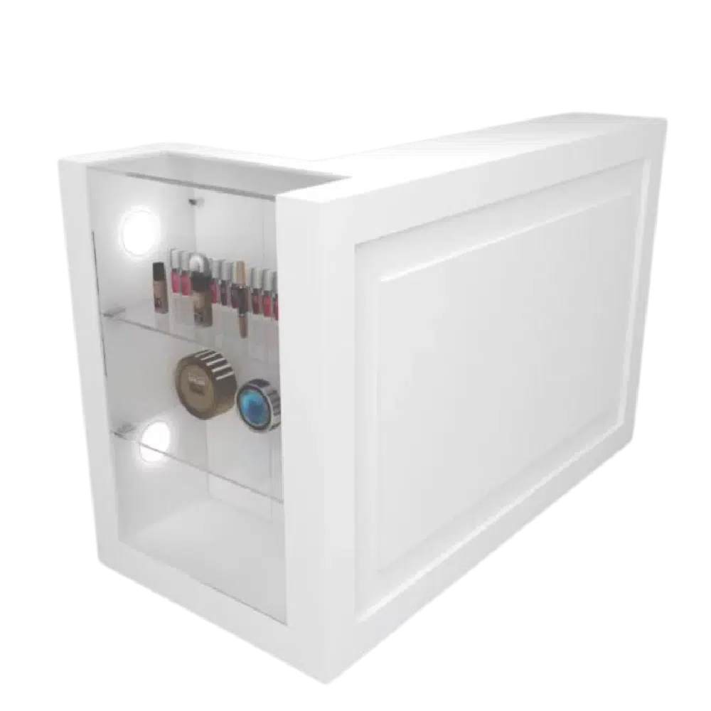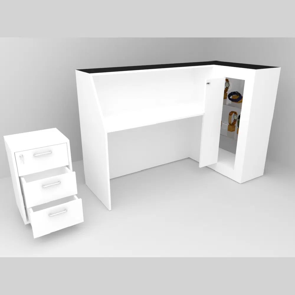 Una recepcion exhibidor en melamina blanca con enchape en formalita de color, tiene un diseño elegante, además de ser funcional para tu negocio, su instalacion en todo Santiago, se realizan envíos a regiones.
