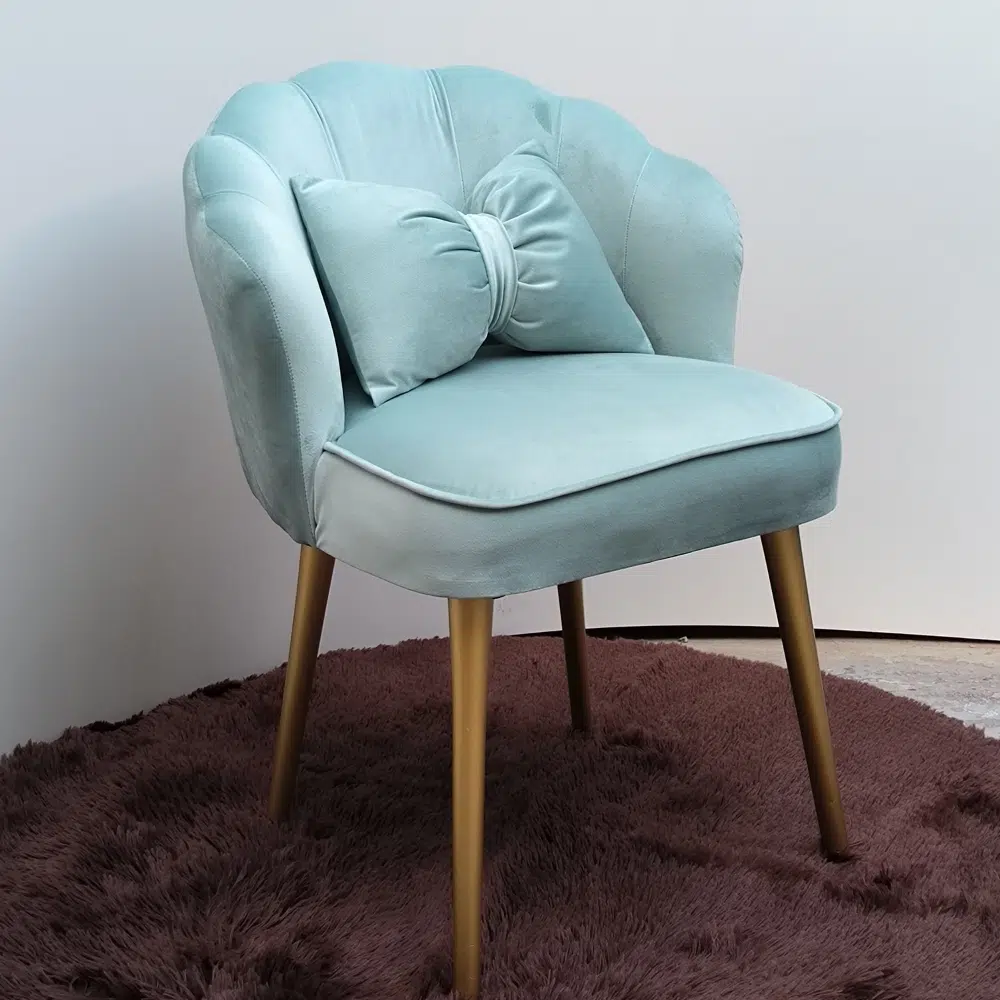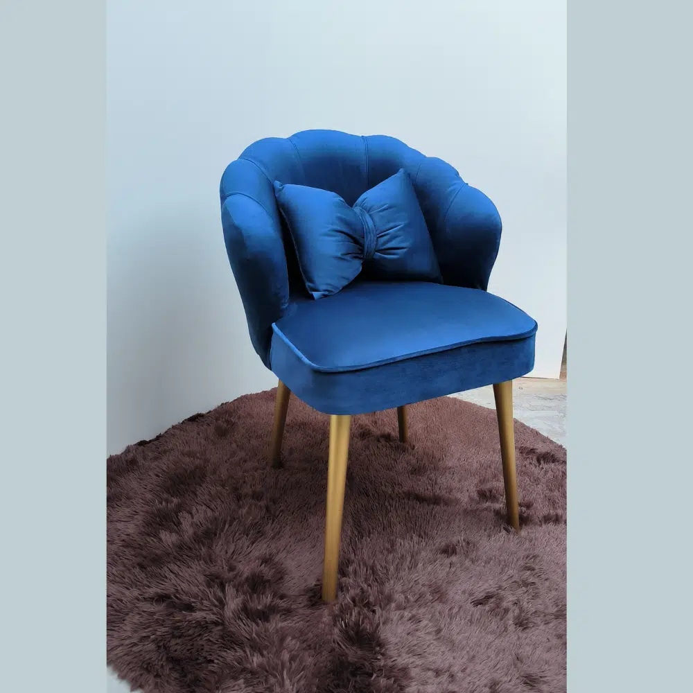 Hermosa silla sitial acolchada, de estrilo nordico con un cojin grueso y un respaldo en forma de petalo, base en patas de hierro cromadas en color dorado y viene con gomas antidezlizantes para proteger la alfombra en donde ubicaran la silla; además viene con un cojin, diseño funcional e ideal para oficinas, comedor, salones y mas.